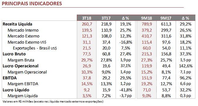 Considerando o total faturado no mercado externo nestes 9M18, US$ 55,4 milhões (após as eliminações das vendas inter-company) são provenientes das unidades controladas, dos quais US$ 16,8 milhões correspondem às novas controladas adquiridas no exterior.