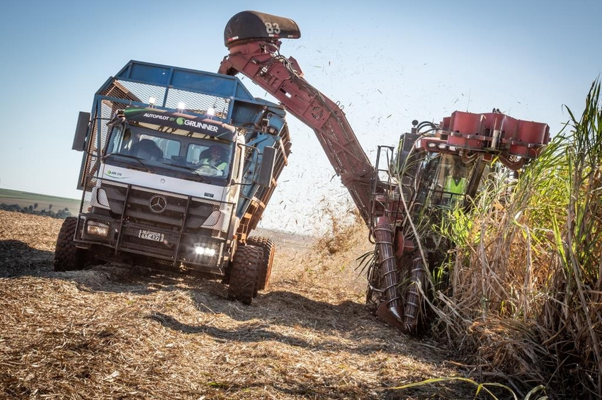 O novo Axor 3131 atua lado a lado com as colhedoras de cana, também de condução autônoma, que fazem a colheita e o corte, já lançando a cana picada diretamente na carroçaria do caminhão. A velocidade média dos veículos gira em torno de 6 km/h na área da colheita.