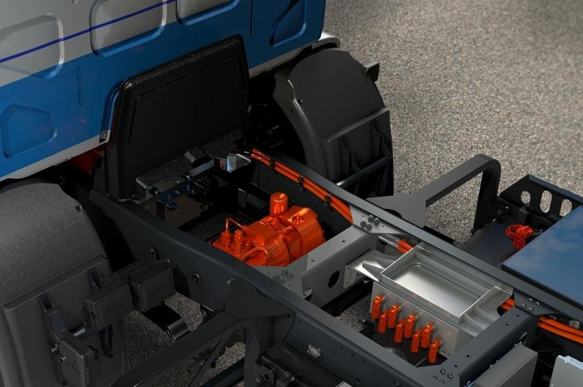 O motor elétrico é alimentado por uma bateria de 85 kWh, que permite rodar no modo totalmente elétrico com autonomia de 30 a 50 quilômetros, dependendo do Peso Bruto Total Combinado. As baterias podem ser carregadas pelo motor diesel durante as operações na estrada, enquanto a carga completa leva 30 minutos e, para uma carga de 80%, são 20 minutos.