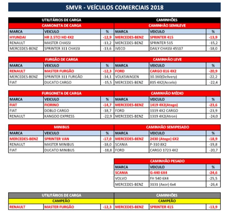Em quatro edições do SMVR-VC, de 2015 a 2018, a Mercedes-Benz venceu em 12 categorias entre Utilitários e Caminhões. Em quatro oportunidades, a marca alemã cravou o título de “Campeão Geral”. Na sequência, a Hyundai em três categorias, sendo duas vez como “Campeão Geral”; a Renault e Volkswagen, três vezes e um título máximo. Fiat, Ford, Volvo Scania e Iveco também venceram nas categorias, mas não anotaram o maior valor de revenda na classificação geral de Utilitários ou de Caminhões.