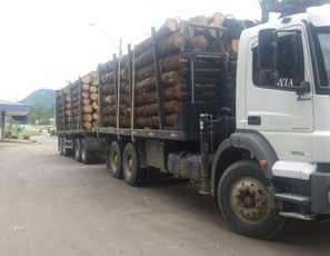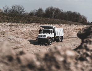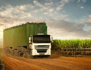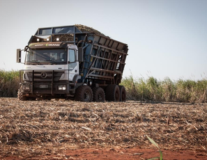 Axor 3131 8x4 de direção autônoma, parceria com a Grunner, carrega até 20 toneladas de cana picada.