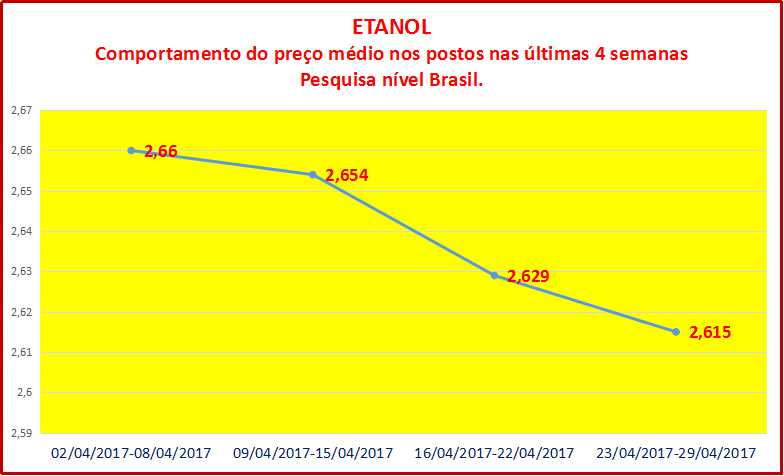 O preço do etanol caiu pela 15ª semana seguida e atingiu R$ 2,615 no fim de abril.