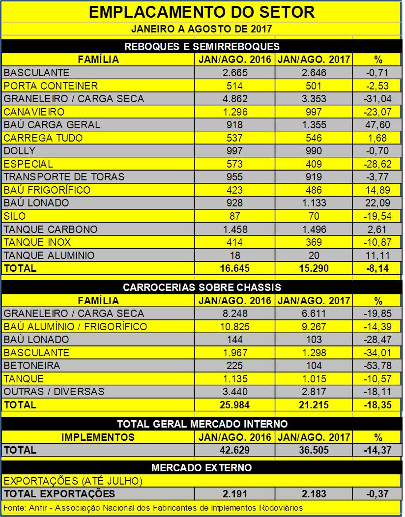 Os negócios para a indústria de implementos rodoviários estão sendo retomados lentamente. Seis segmentos de mercado do setor de Reboques e Semirreboques (Pesados) apresentaram variação positiva de emplacamentos de janeiro a agosto de 2017 sobre o mesmo período do ano passado. São eles Baú Carga Geral, Carrega Tudo, Baú Frigorífico, Baú Lonado, Tanque Carbono e Tanque Alumínio. Os segmentos Basculante e Dolly apresentaram variação negativa menor que 1%: 0,71% e 0,70% respectivamente.