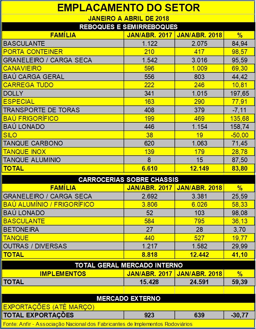 A indústria de implementos rodoviários apresentou variação positiva de 59,39% nos primeiros quatro meses do ano. De janeiro a abril foram emplacados 24.591 produtos ante 15.428 unidades em igual período de 2017. “Esses números indicam que a retomada segue em seu curso e a indústria poderá recuperar uma parte de suas perdas acumuladas ainda este ano”, afirma Norberto Fabris, presidente da ANFIR-Associação Nacional dos Fabricantes de Implementos Rodoviários.