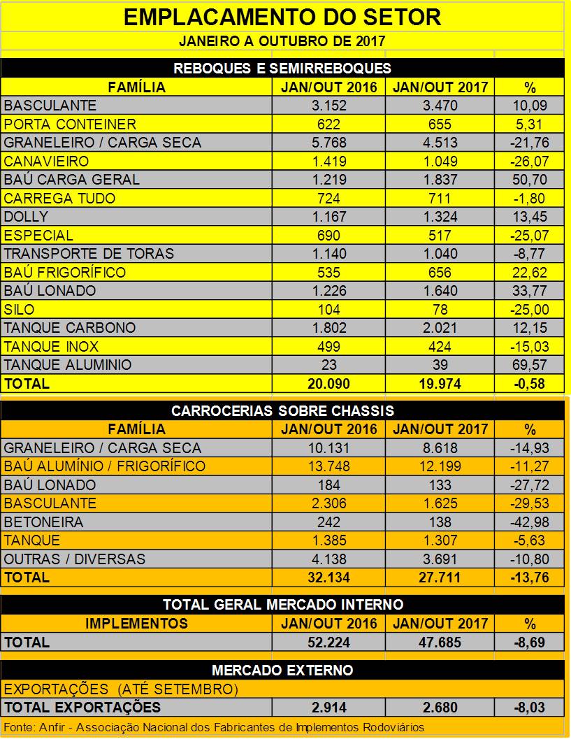 Emplacamentos de Reboques e Semirreboques de janeiro a outubro somam 19.974 unidades contra 20.090 produtos em igual período de 2016 o que representa retração de 0,58%; No total a indústria ainda registra resultado negativo de 8,03%, o menor índice de retração no ano.