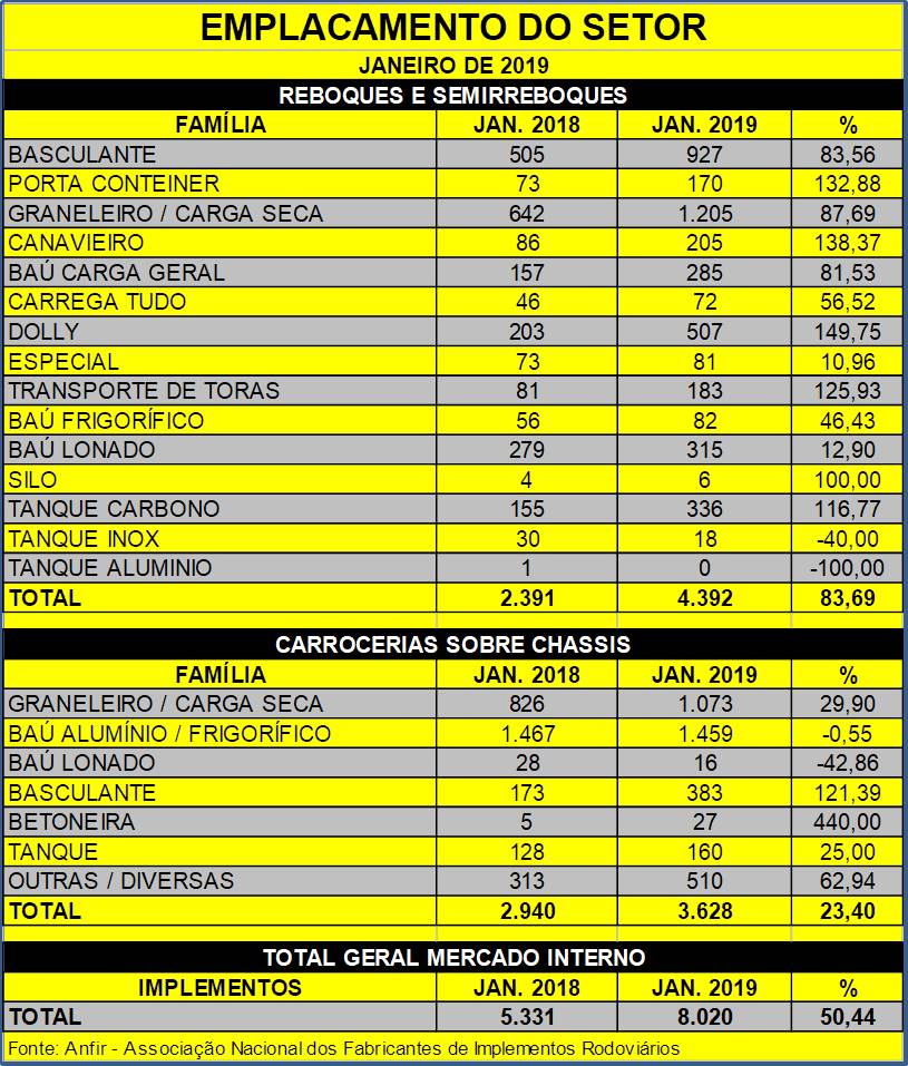 Os negócios para a indústria de implementos rodoviários no primeiro mês de 2019 seguem no ritmo de recuperação registrado em 2018. Em janeiro desse ano foram emplacados 8.020 produtos ante 5.331 entregues ao mercado no mesmo mês de 2018. Isso representa variação positiva de 50,44%.