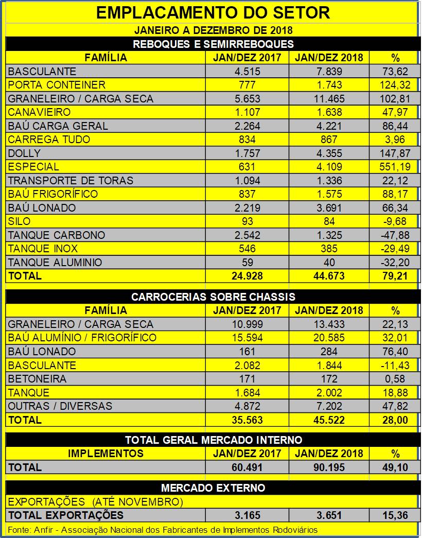 Volume total de implementos rodoviários emplacados em 2018 foi de 90.195 unidades ante 60.491 produtos no ano anterior; Reposição das perdas ainda vai demorar, avalia ANFIR.