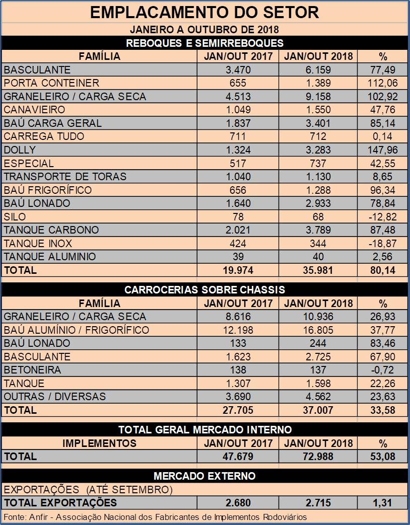 No mercado externo os esforços da ANFIR junto com a Apex-Brasil para dar suporte à expansão comercial do setor na América Latina dão bons frutos. De janeiro a setembro foram vendidos ao exterior 2.715 Reboques e Semirreboques, um volume 1,31% acima do mesmo período de 2017. “O programa de exportação é uma ferramenta importante no processo contínuo de internacionalização da nossa indústria”, conclui Fabris.