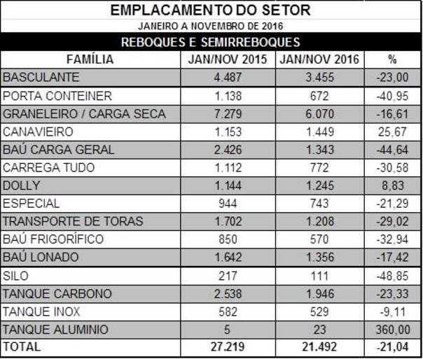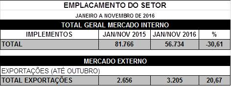 No total de janeiro a novembro de 2016 os emplacamentos de implementos rodoviários apresentaram retração de 30,61% ante o mesmo período de 2015. Em 11 meses a indústria entregou ao mercado 56.734 unidades contra 81.766 no ano passado.