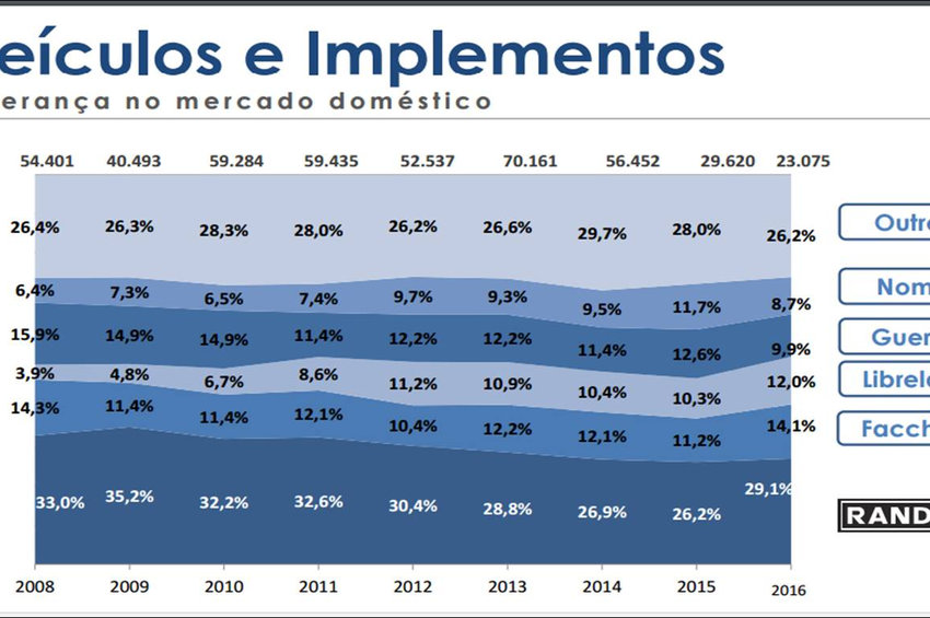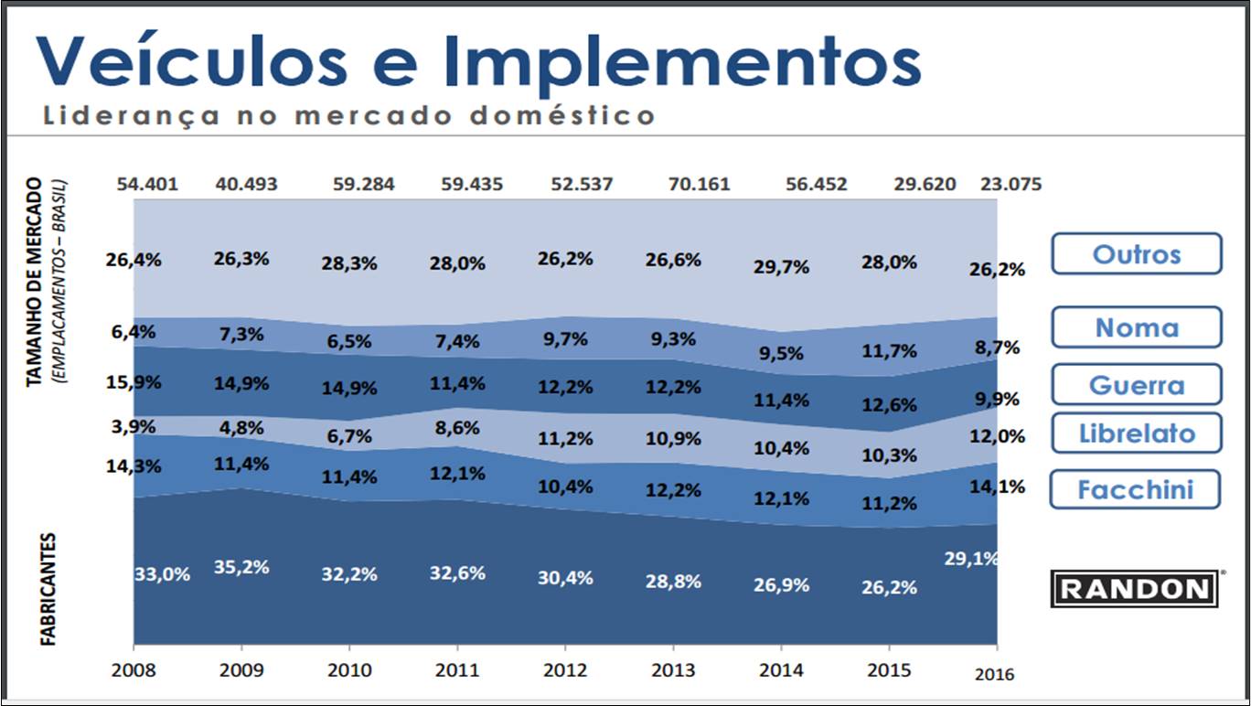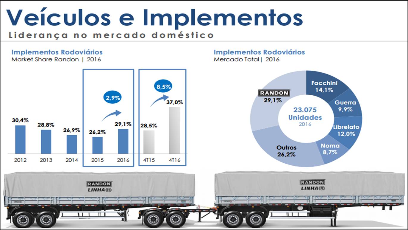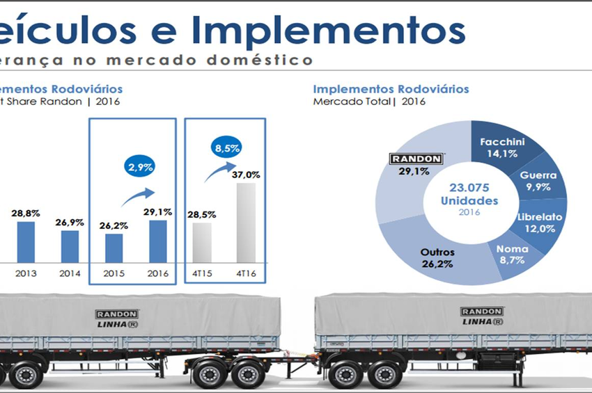 Montadora – Além da venda de veículos rebocados, esta divisão também produz vagões ferroviários e veículos especiais (retroescavadeiras, caminhões fora-de-estrada e minicarregadeiras) que, juntos, somam uma receita líquida de R$ 1,2 bilhão. A venda de semirreboques representou 65,1% dos negócios desta divisão em 2016, com a entrega de 9.850 unidades (- 6,9%). Mesmo assim, a Randon ampliou seu Market share no ano, que passou de 26,2% em 2015 para 29,1% em 2016. O mercado doméstico de semirreboques total (Brasil) caiu 22,1% com 23.075 unidades vendidas em 2016. A venda de vagões ferroviários (31,9% da receita líquida da Randon) alcançou 1.584 unidades, uma queda de 20,8% sobre 2015, quando foram entregues 1.999 vagões. O mercado brasileiro de vagões demandou 3.903 unidades em 2016, sendo que 40,6% foram fabricados pela Randon. As vendas de veículos especiais foram diretamente afetadas pela falta de investimento governamental e pela baixa demanda da construção civil, e representaram 3,1% das receitas da divisão montadora. Foram vendidos 196 veículos (- 44,8%), sendo 188 retroescavadeiras e 8 caminhões fora-de-estrada.