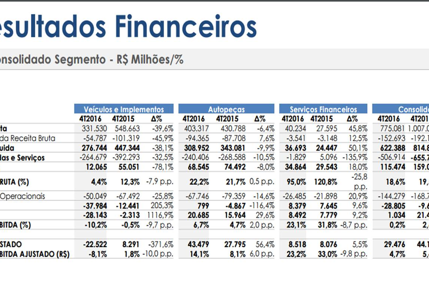Em 2016, a receita bruta total da Randon S.A,com impostos e antes da consolidação, somou R$ 3,7 bilhões, 13,1% inferior à de 2015. No mesmo exercício, a receita líquida consolidada atingiu R$ 2,6 bilhões, 15,3% menor quando comparada ao ano anterior. A divisão autopeçasrespondeu por 50,1% das receitas da Companhia e a divisão implementos por 44,4%, enquanto os serviços financeiros representaram 5,5%. A participação menor (5,6 pontos percentuais) da área de implementos na receita é creditada à redução de 20,8% no volume de vagões faturados. O EBITDA de R$ 142,7 milhões registrado no último ano foi 11,8% inferior a 2015 e o EBITDA Ajustado ao final de 2016 somou R$ 252,1 milhões.