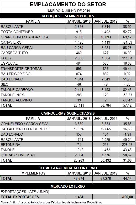 De janeiro a julho foram emplacados 67 mil produtos; Maior parte dos implementos rodoviários de volume elevado de vendas registra variação positiva.