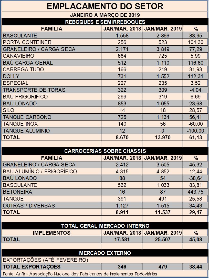 O primeiro trimestre de 2019 consolida a recuperação gradual dos negócios no setor produtor de implementos rodoviários. De janeiro a março a indústria entregou ao mercado 25.507 unidades ante 17.581 produtos no primeiro trimestre de 2018. Isso representa variação positiva de 45,08%.