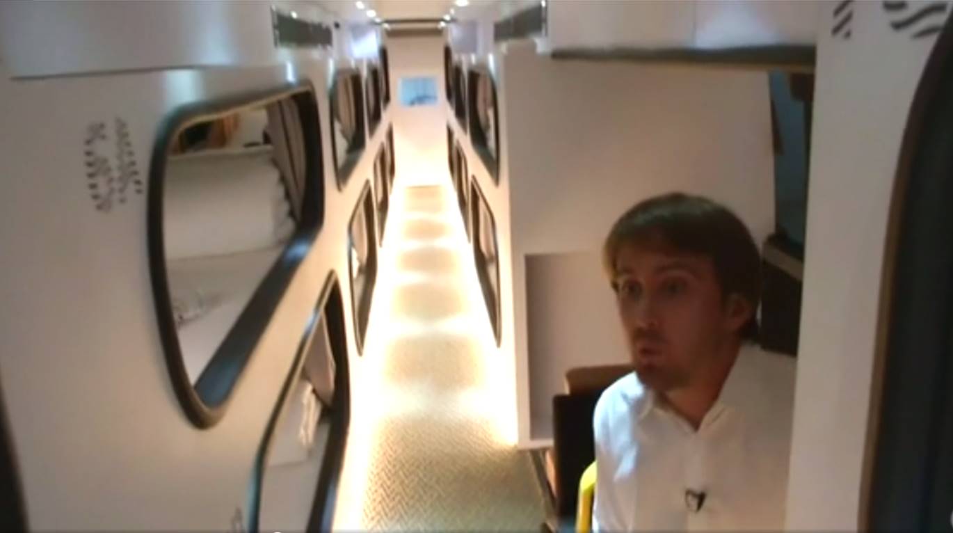 Esse ônibus de luxo, com cabines para um total de 24 passageiros, quer competir com outros meios de transporte como aviões, trens e carros.