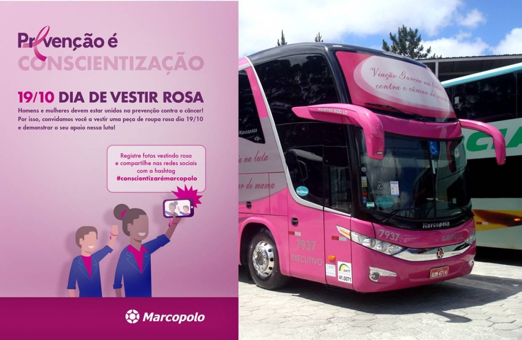 Com foco em conscientização sobre a importância da prevenção e da realização de exames de câncer de mama e de colo de útero, a Marcopolo promoverá ao longo desta semana uma série de ações como blitz e palestras. Nas unidades de Caxias de Sul as ações acontecem em parceria com o SESI. Nos dias 18 e 19 de outubro haverá a palestra "CICLOS DA VIDA E MAMA AMIGA" ministrada por uma representante do SESI e o depoimento da jornalista do jornal Pioneiro, Ivanete Marzzaro, que contará sua história de batalha contra o câncer de mama, como a doença mudou a sua vida e como enfrentar este momento com bom humor, alto astral e otimismo.