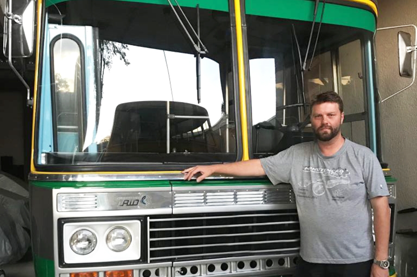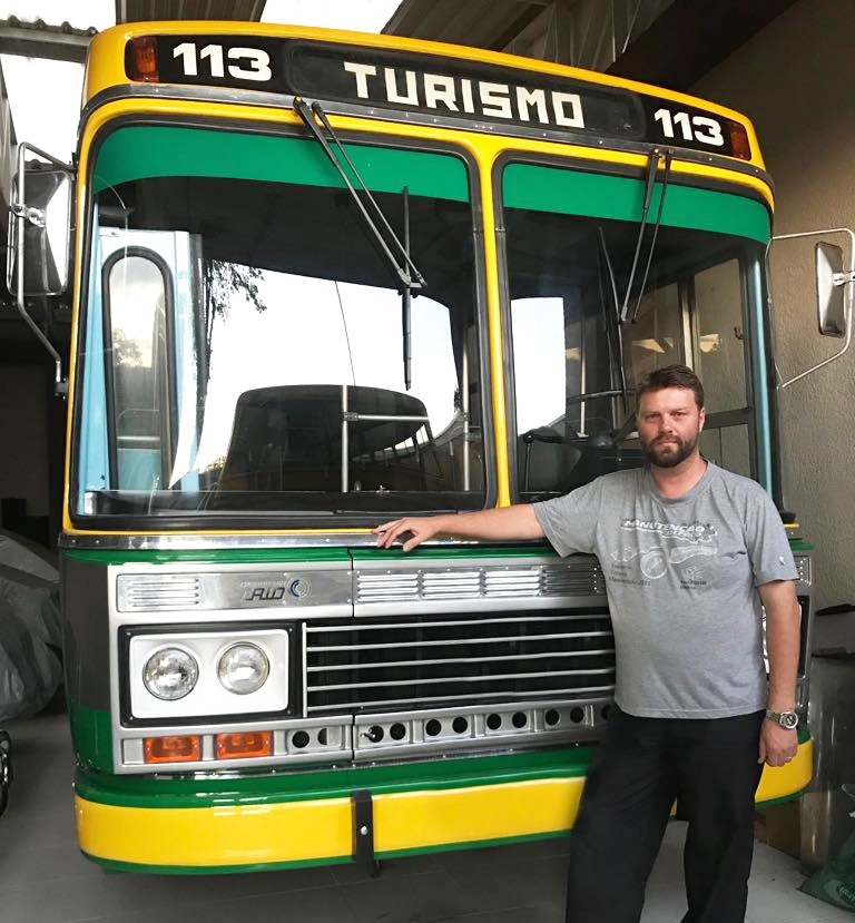 Eduardo Tows, trabalha há 20 anos com ônibus e em sua coleção pessoal conta com cinco carros antigos e dois ônibus, sendo um deles, o Caio Gabriela.