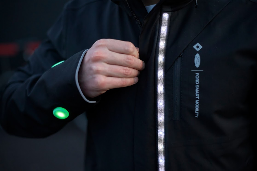 A jaqueta inteligente da Ford tem luzes de LED nas mangas que se acendem automaticamente quando o ciclista levanta o braço para avisar que vai virar à direita ou à esquerda, além de luz de freio. Conta também com um aplicativo de navegação, conectado sem fio a um smartphone, que gera uma vibração na manga correspondente para indicar a direção a seguir, selecionando rotas que evitam ruas movimentadas e cruzamentos.